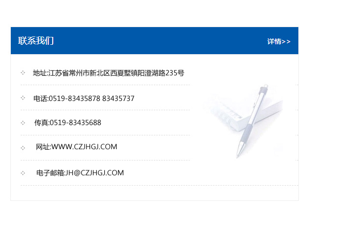 地址:常州市新北區友邦商務大廈1幢16、17層  電話:0519-85101652  傳真:0519-85112595  郵編:213022  網址:www.cz-jiayue_cn.sj-56.com  郵箱:xiajifengaa@163.com
